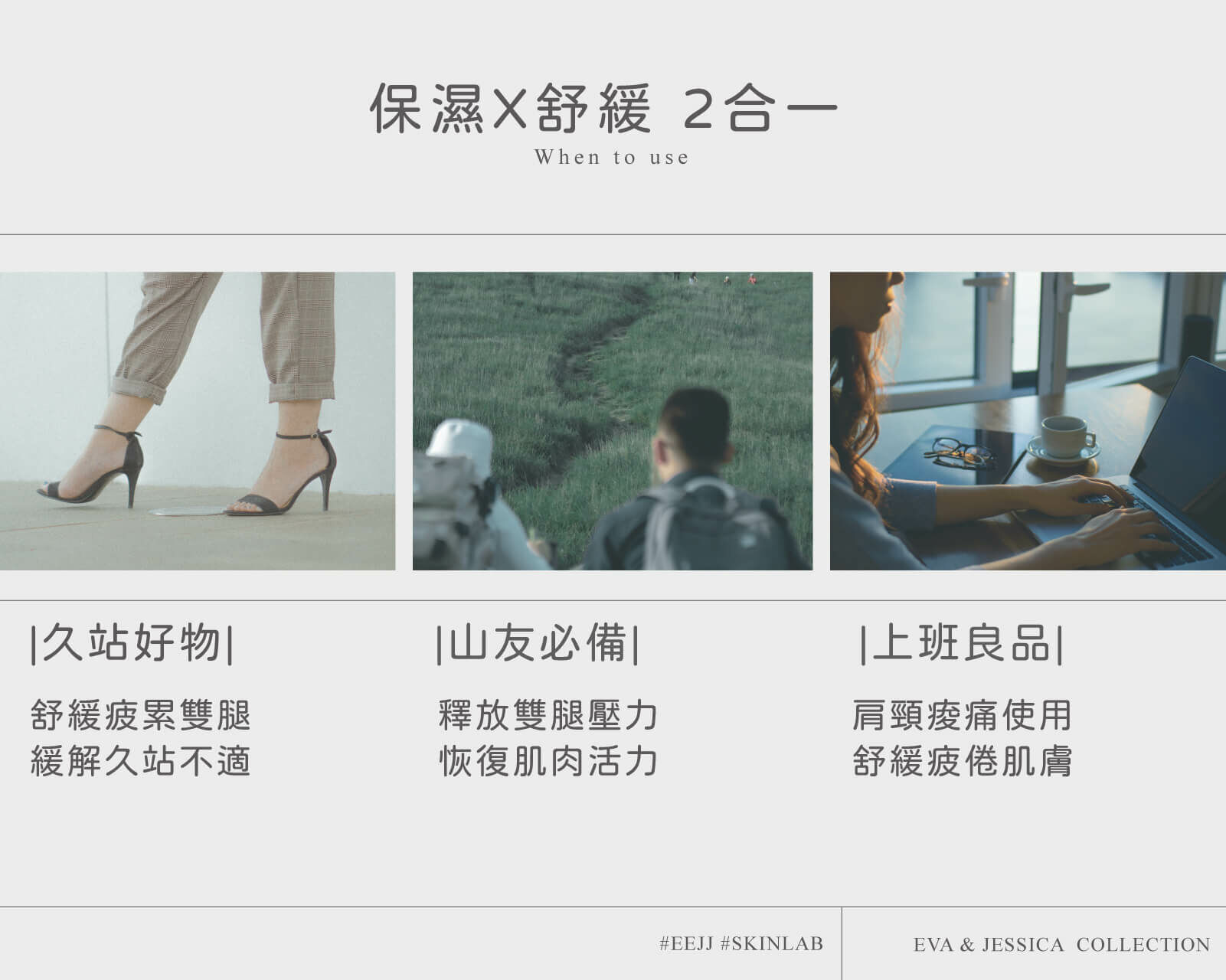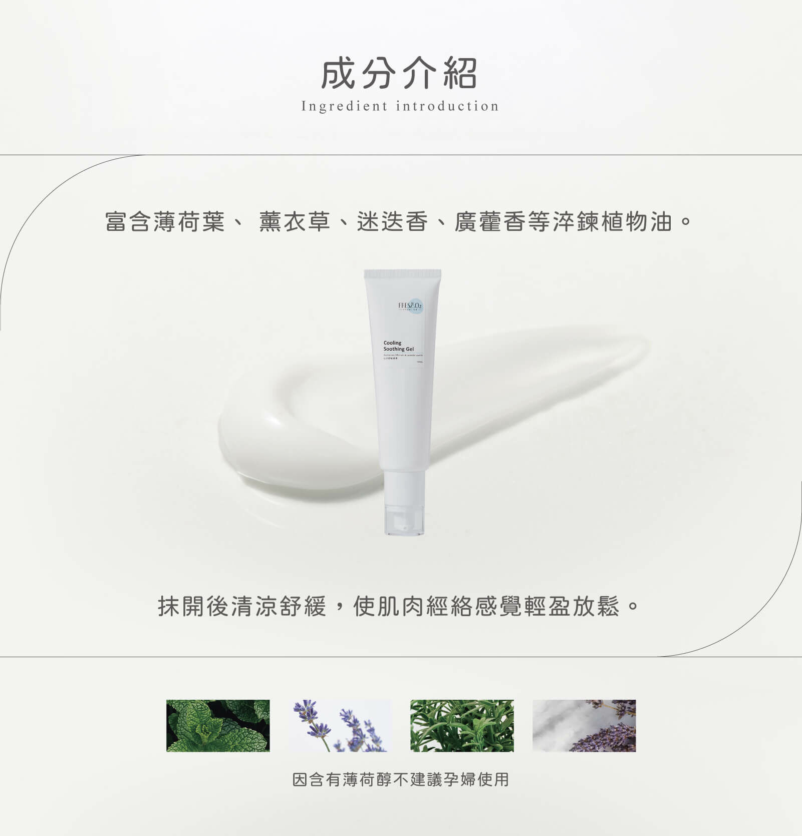 清爽水感凝乳質地,好吸收、不黏膩,富含薄荷葉、薰衣草、迷迭香、廣藿香等淬鍊植物油,有效舒緩疲累的雙腿,釋放肌肉緊張與壓力。