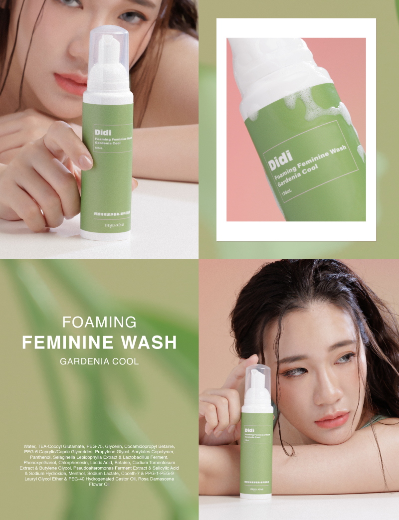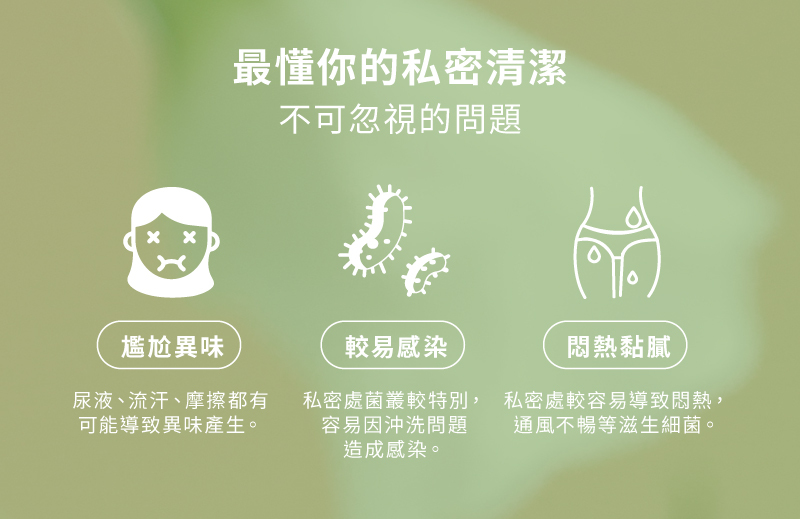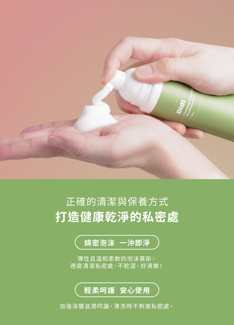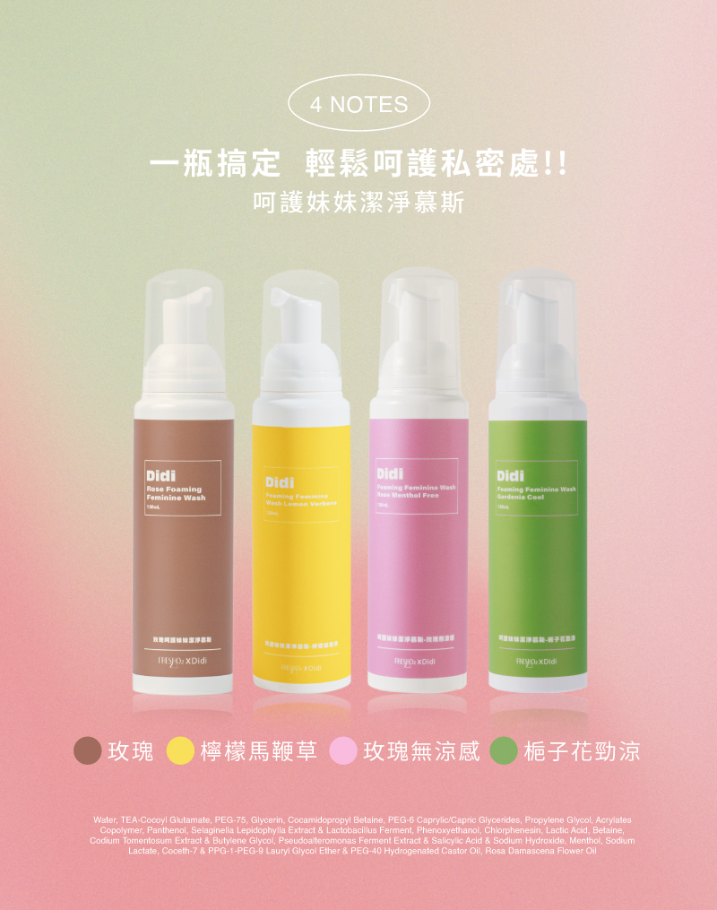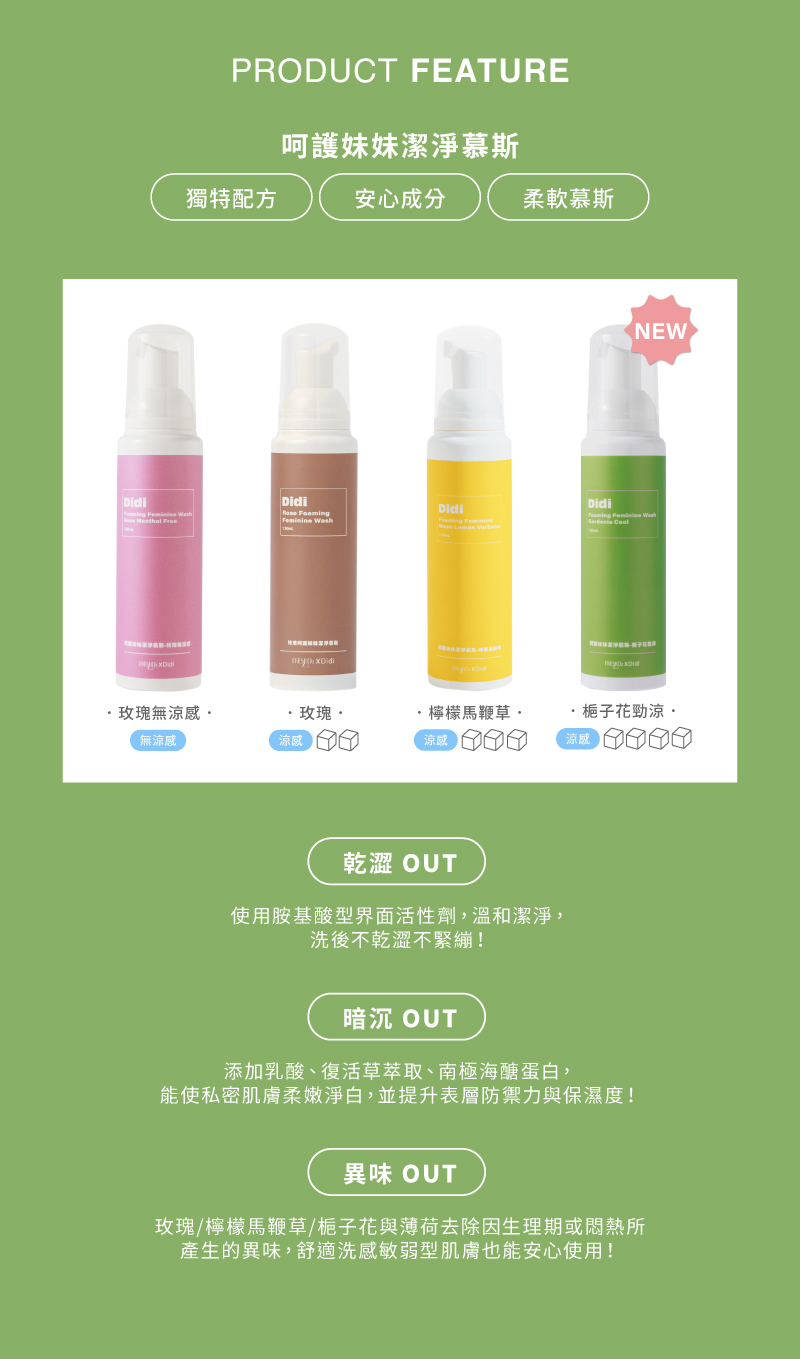 針對私密部位的弱酸環境研發,使用胺基酸型界面活性劑溫和潔淨,洗後不乾澀、不緊繃,添加乳酸、復活草萃取、南極海醣蛋白,能使私密肌膚柔嫩淨白,並提升皮層防禦力與保濕度,搭配檸檬馬鞭草/玫瑰精油與薄荷去除因生理期或悶熱所產生的異味,舒適洗感敏弱型肌膚也能安心使用。