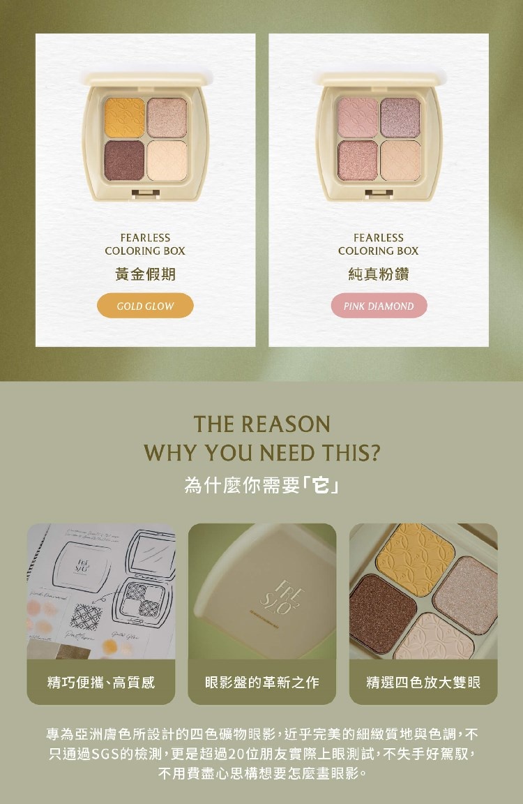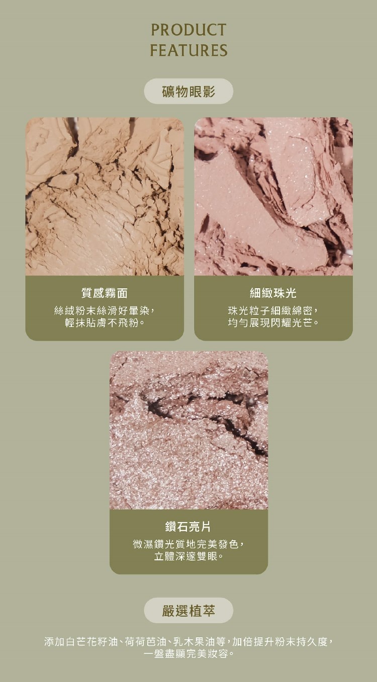 精選四色礦物眼彩,質地絲滑好暈染、服貼不飛粉,添加白芒花籽油、荷荷芭油、乳木果油等萃取,加倍提升粉末持久度,完美呈現閃耀光彩,一盤盡顯精緻妝容。