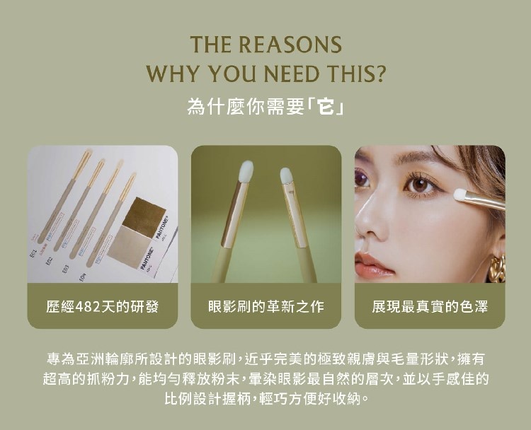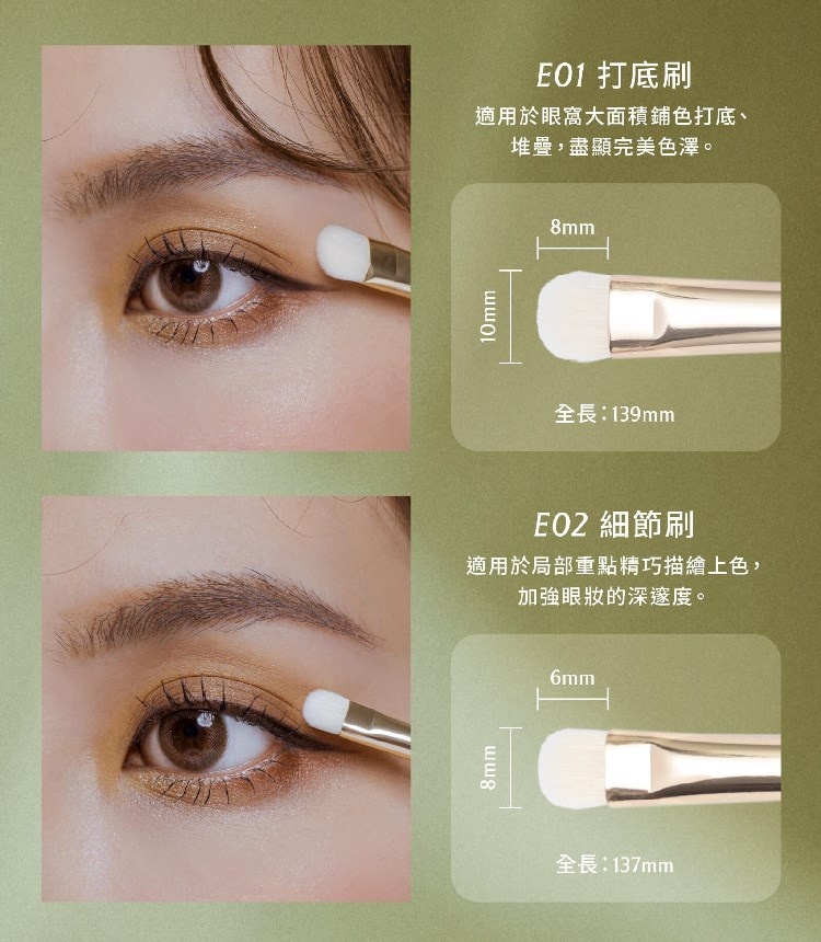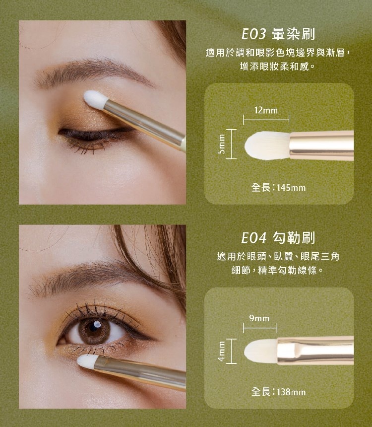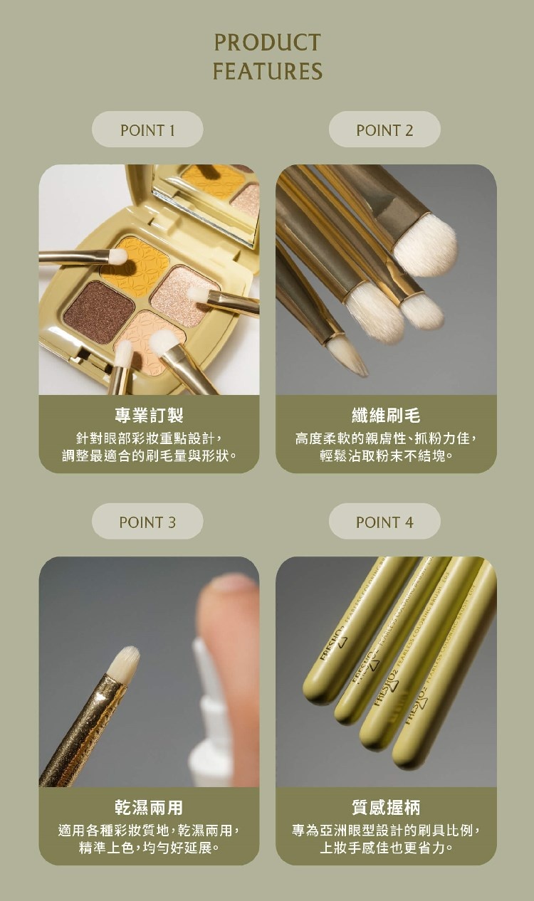 針對眼部彩妝重點設計最適合的刷毛量與形狀,具有高度柔軟的親膚性、抓粉力極佳,輕鬆沾取粉末精準上色,均勻好延展,打造細緻的完美妝容。
