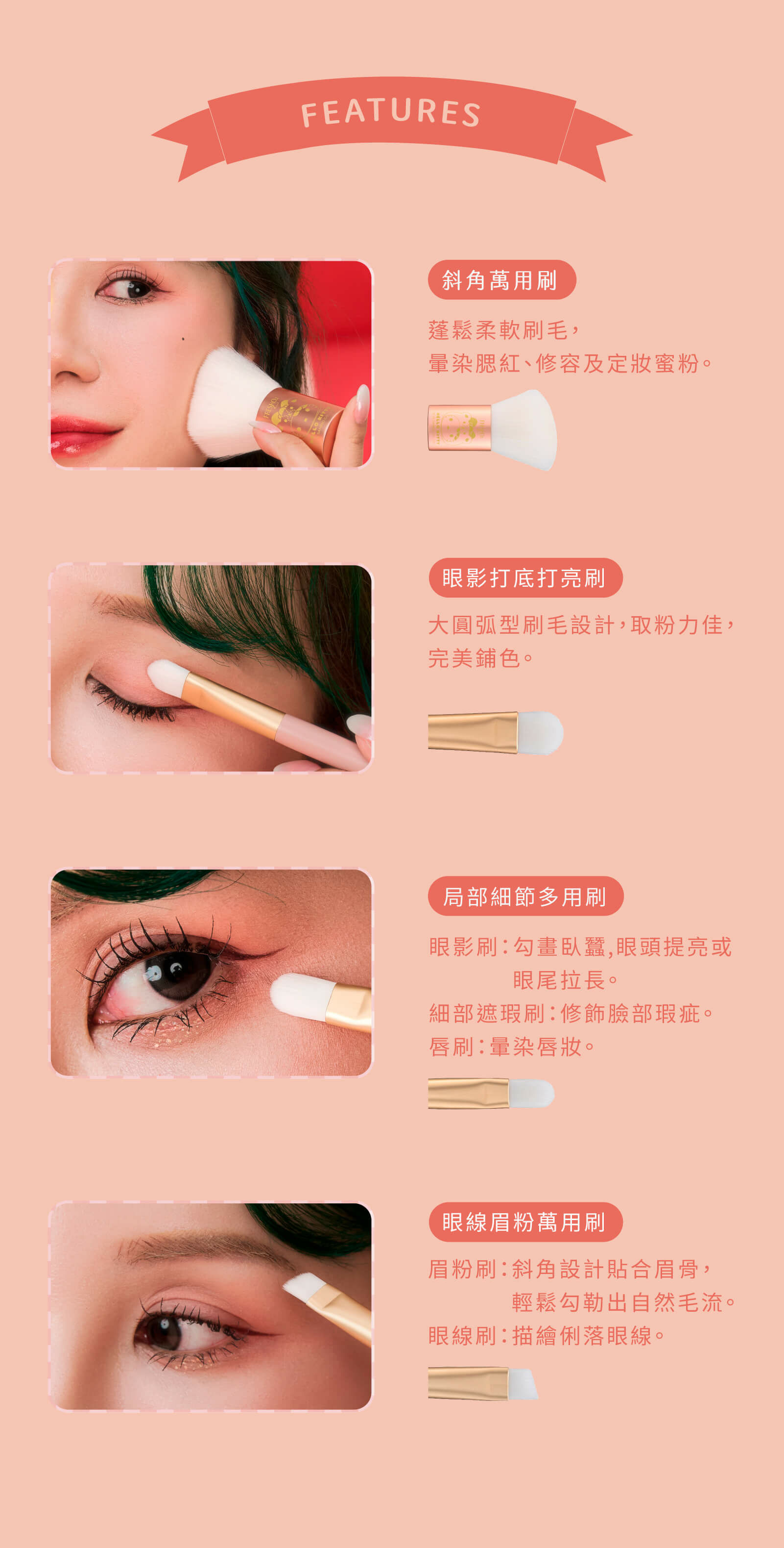 「局部細節多用刷」扁舌刷頭設計,用於勾畫臥蠶、眼頭提亮或眼尾拉長,也可作為細部遮瑕刷或作為唇刷使用。