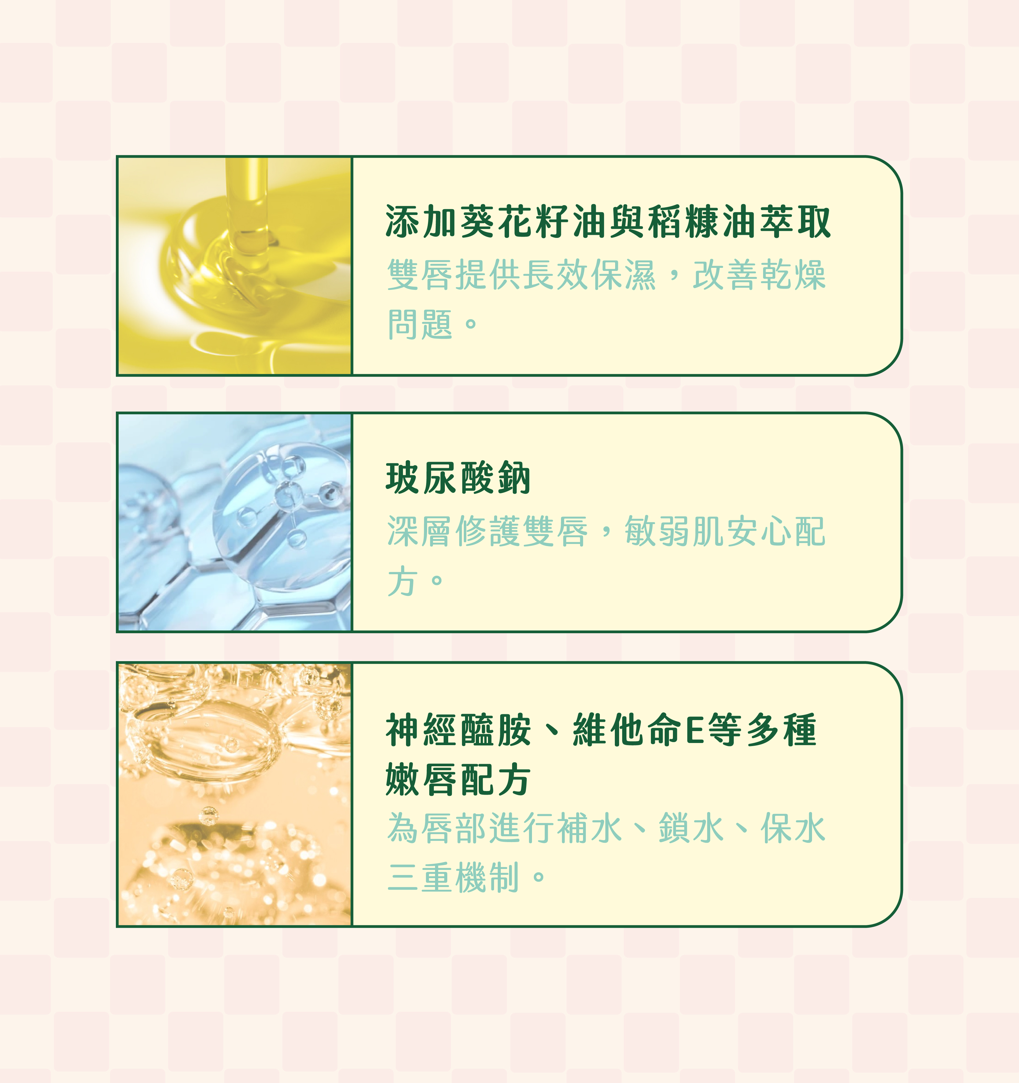 添加葵花籽油、稻糠油、玻尿酸鈉、茶葉等多種嫩唇配方,修護保濕雙唇,