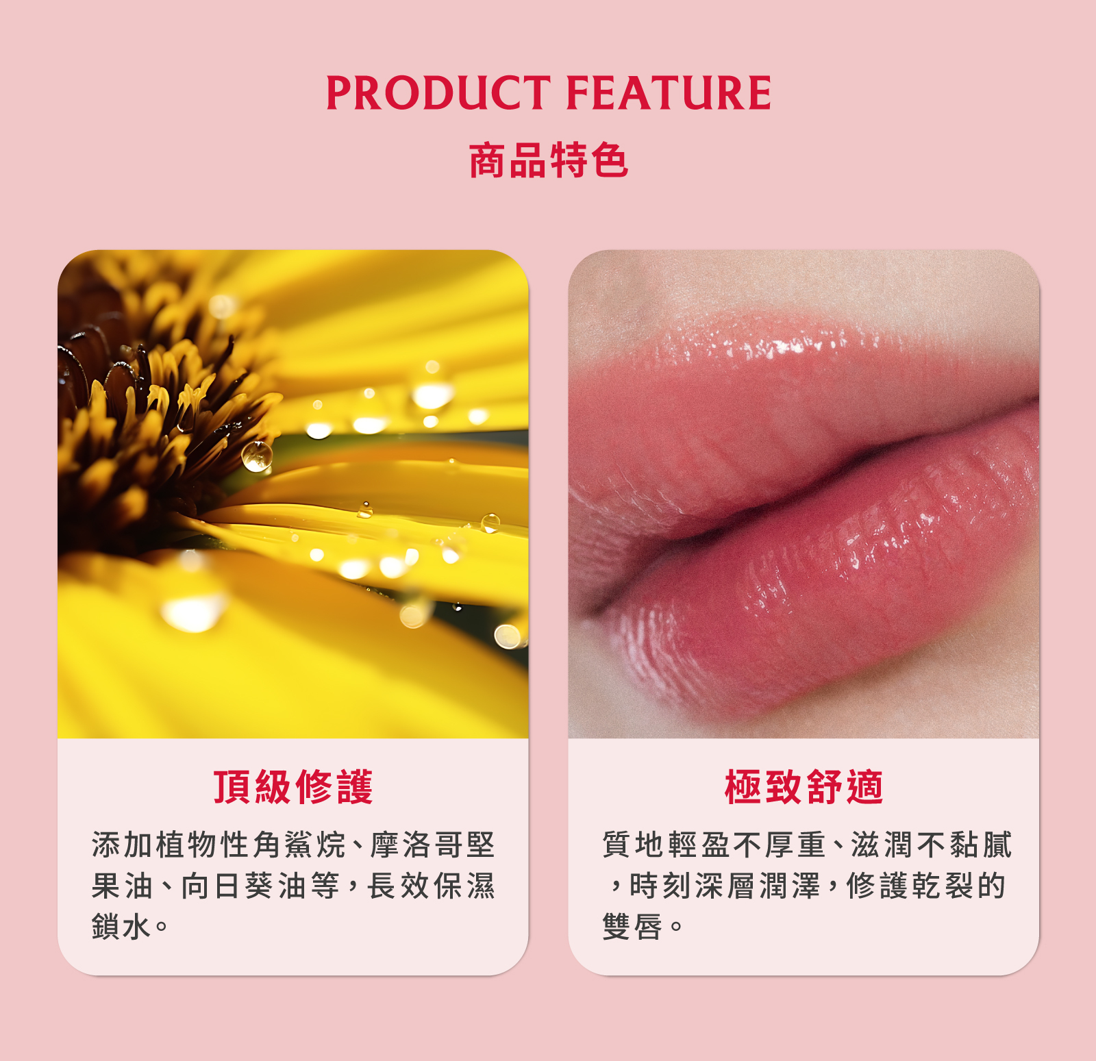 添加植物性角鯊烷、摩洛哥堅果油、向日葵油等多種嫩唇配方,時刻為唇部進行補水、鎖水、保水三重深層修護,輕透不黏膩,有效修護滋養乾裂的雙唇。