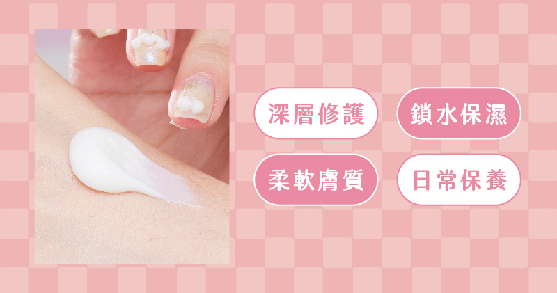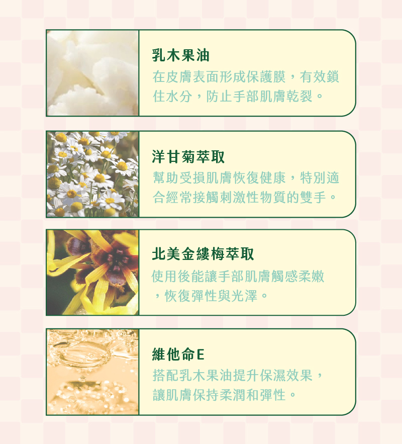 質地柔滑保濕不油膩,添加多重保濕配方,以溫和的乳木果油為滋潤基底,搭配洋甘菊萃取、北美金縷梅萃取、維他命E舒緩乾癢、龜裂脫皮,深層保濕直達肌底,同時調理肌膚紋路、修護受損皮層,於雙手形成防護水膜。