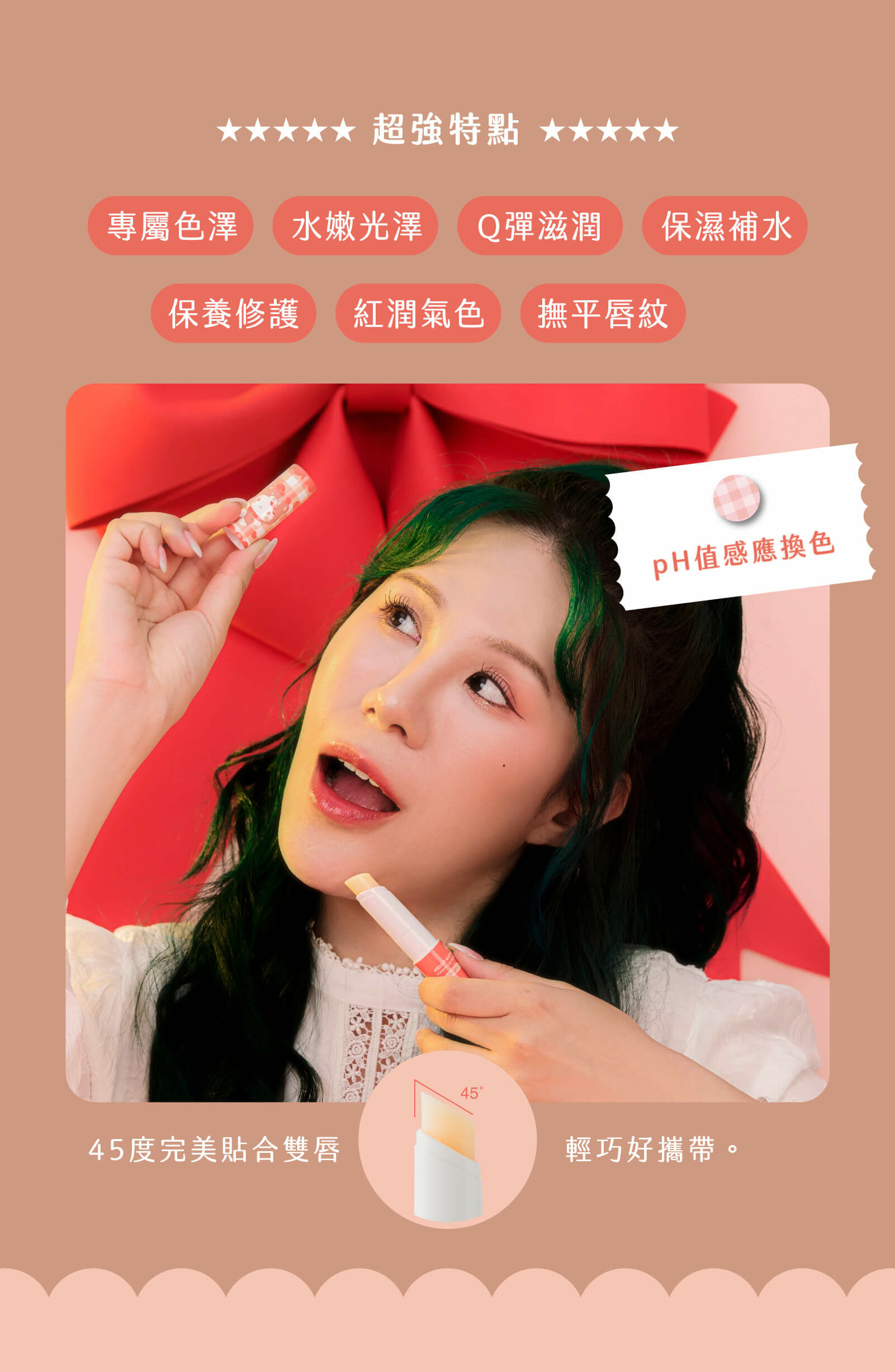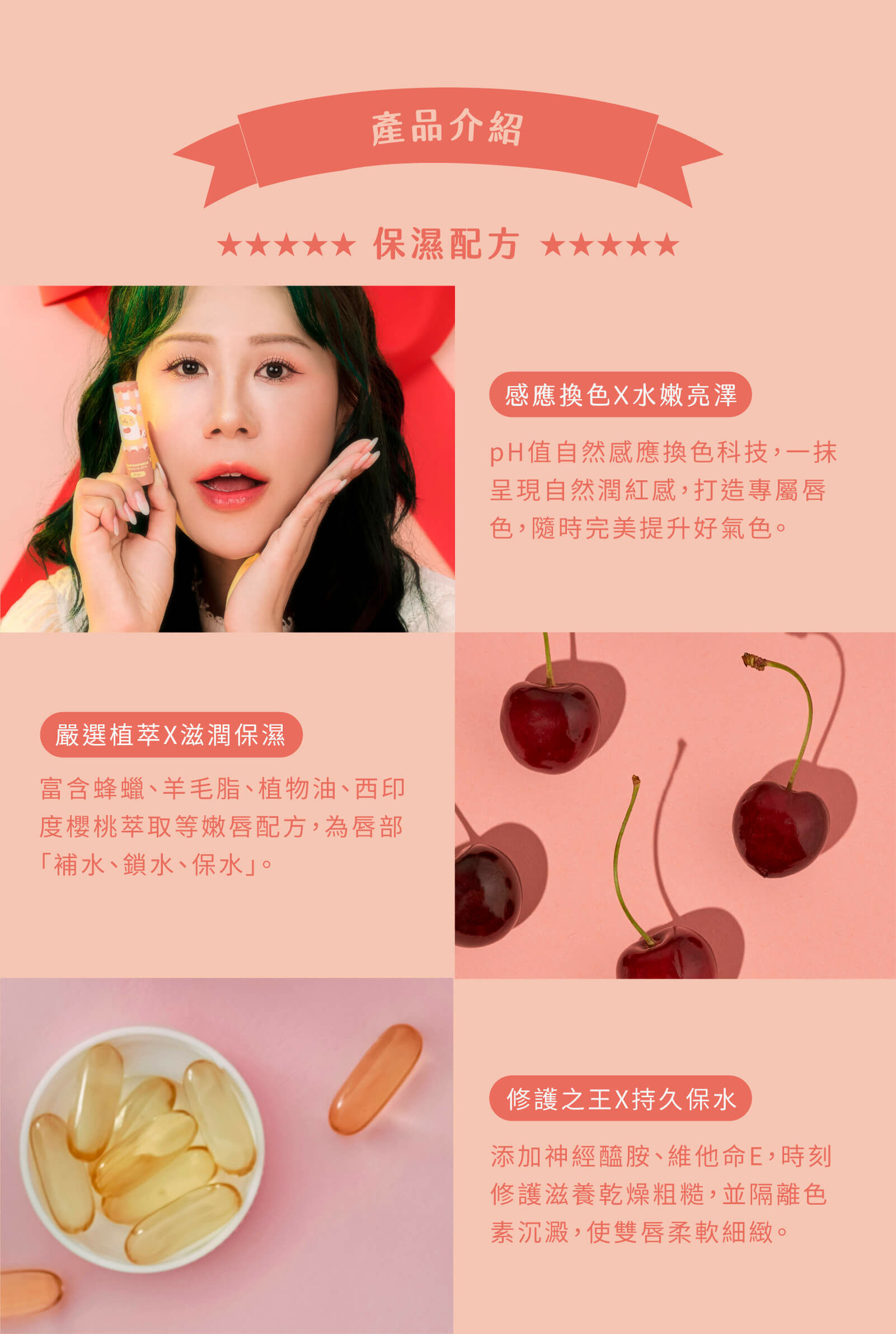 添加神經醯胺、維他命E、西印度櫻桃萃取及植物油萃取等多種嫩唇配方,時刻為唇部進行補水、鎖水、保水三重深層修護,加上獨特的pH值換色科技,打造自然粉嫩好感唇色。