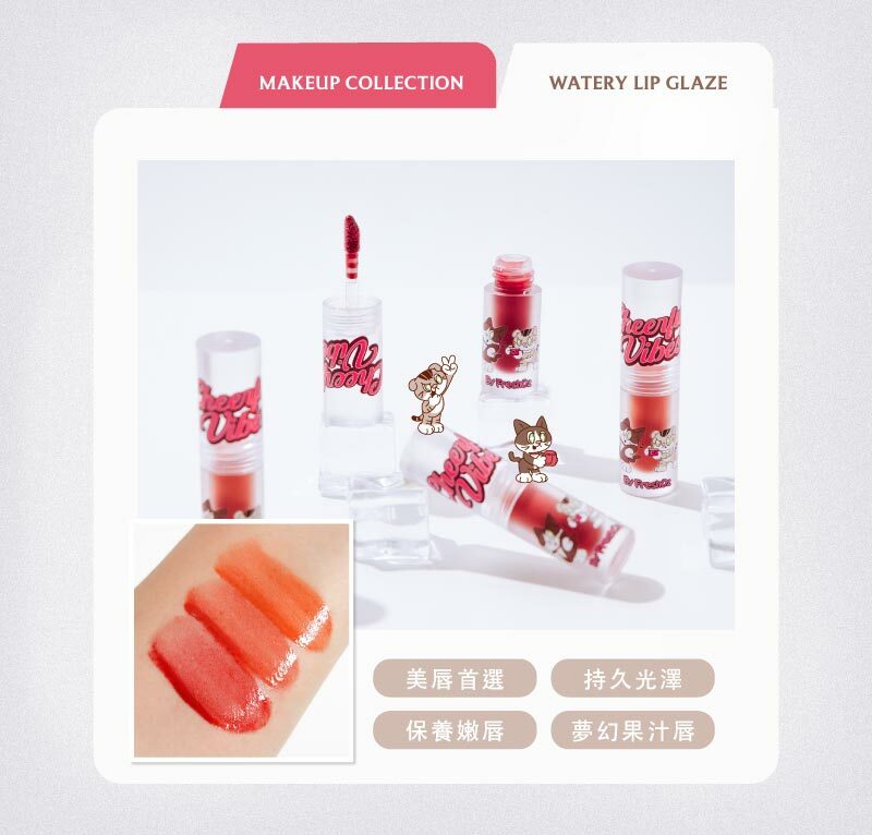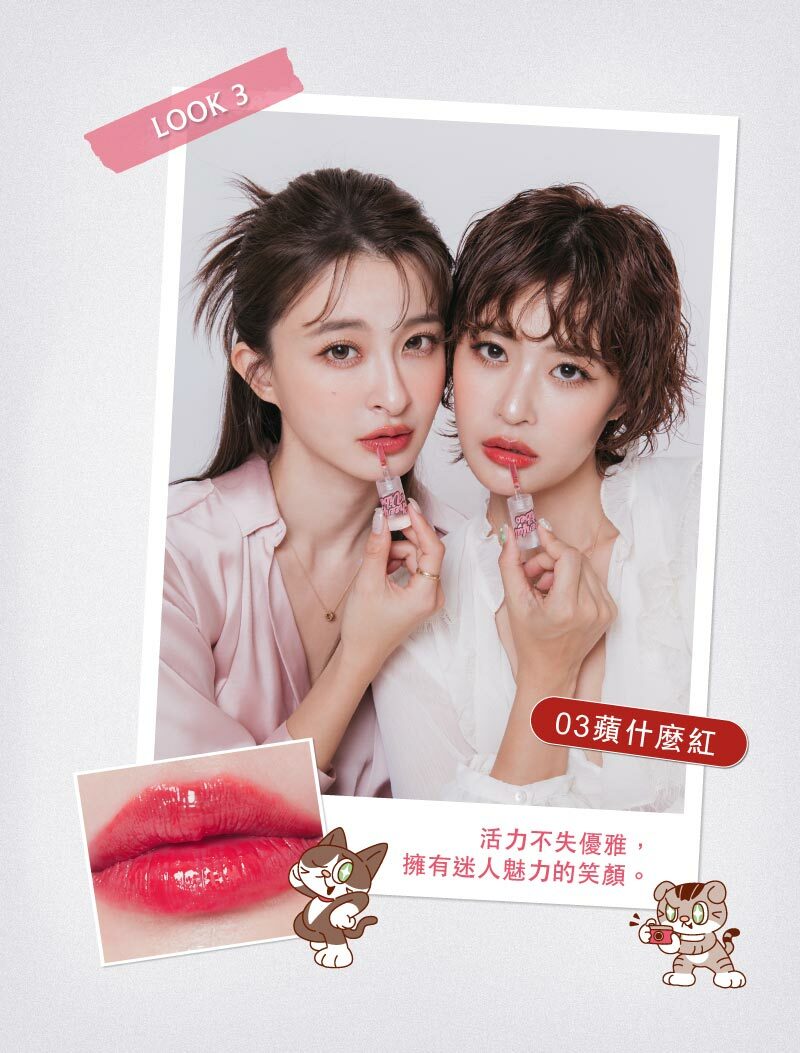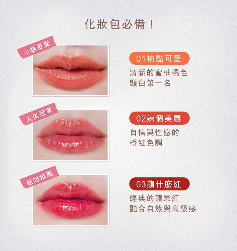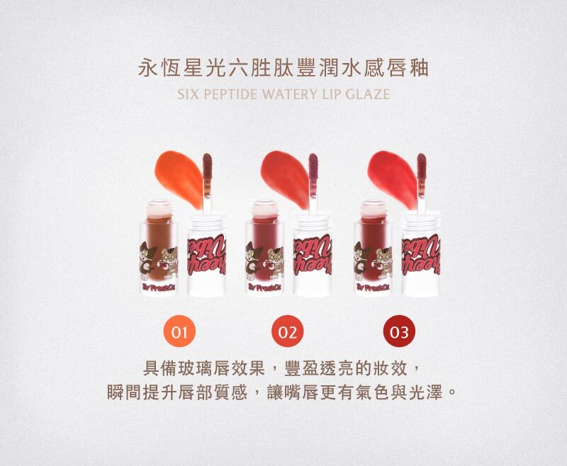 添加維生素E、大豆油、小麥胚芽油、六胜肽等美唇保養成分,質地輕盈不黏膩,展現持久光澤感。
