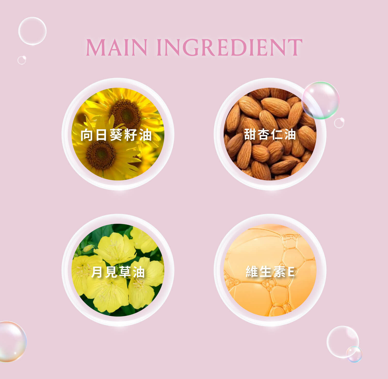 選用「向日葵籽油」「甜杏仁油」「月見草油」「維生素E」等天然植物油萃取為基底,撫平毛躁髮絲。
