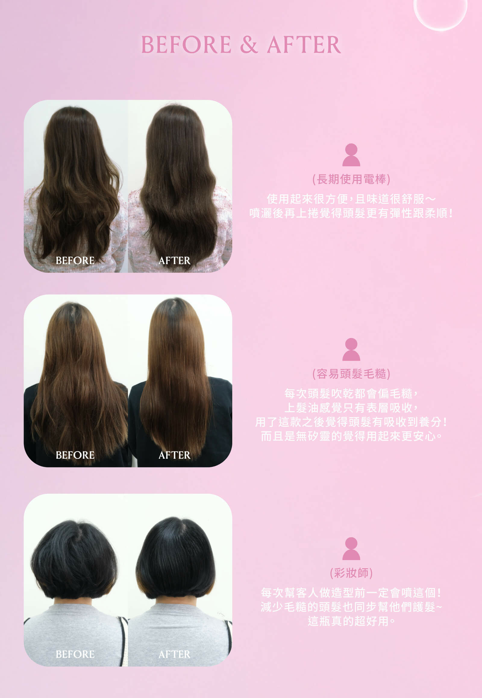 清爽且快速吸收不黏手的質地,可於髮絲表面形成極薄保護膜,修護染燙受損髮絲,重現柔順光澤的秀髮。