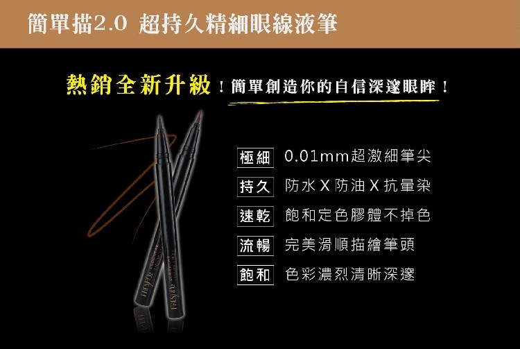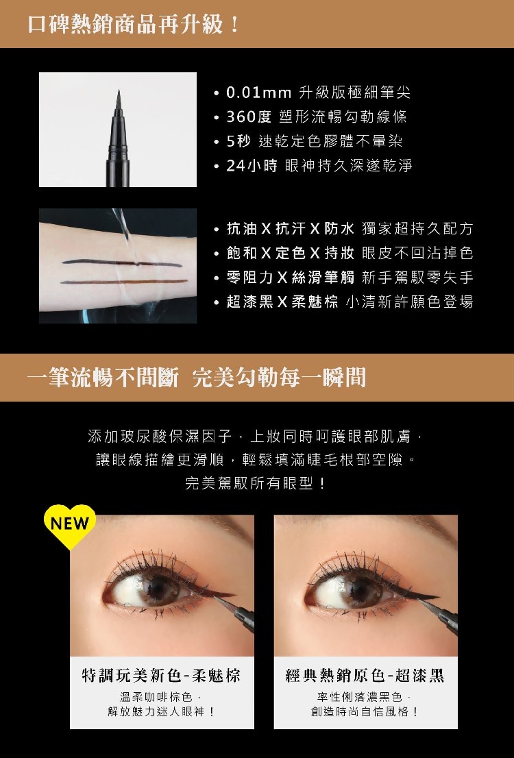 超激細0.01mm筆頭,一抹流暢不失手,獨家抗油持久膠體,完美再升級,創造自信深邃眼眸。
