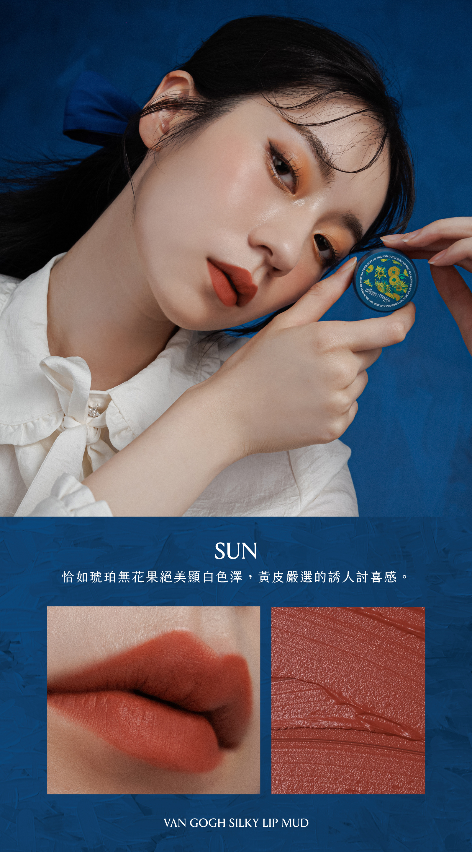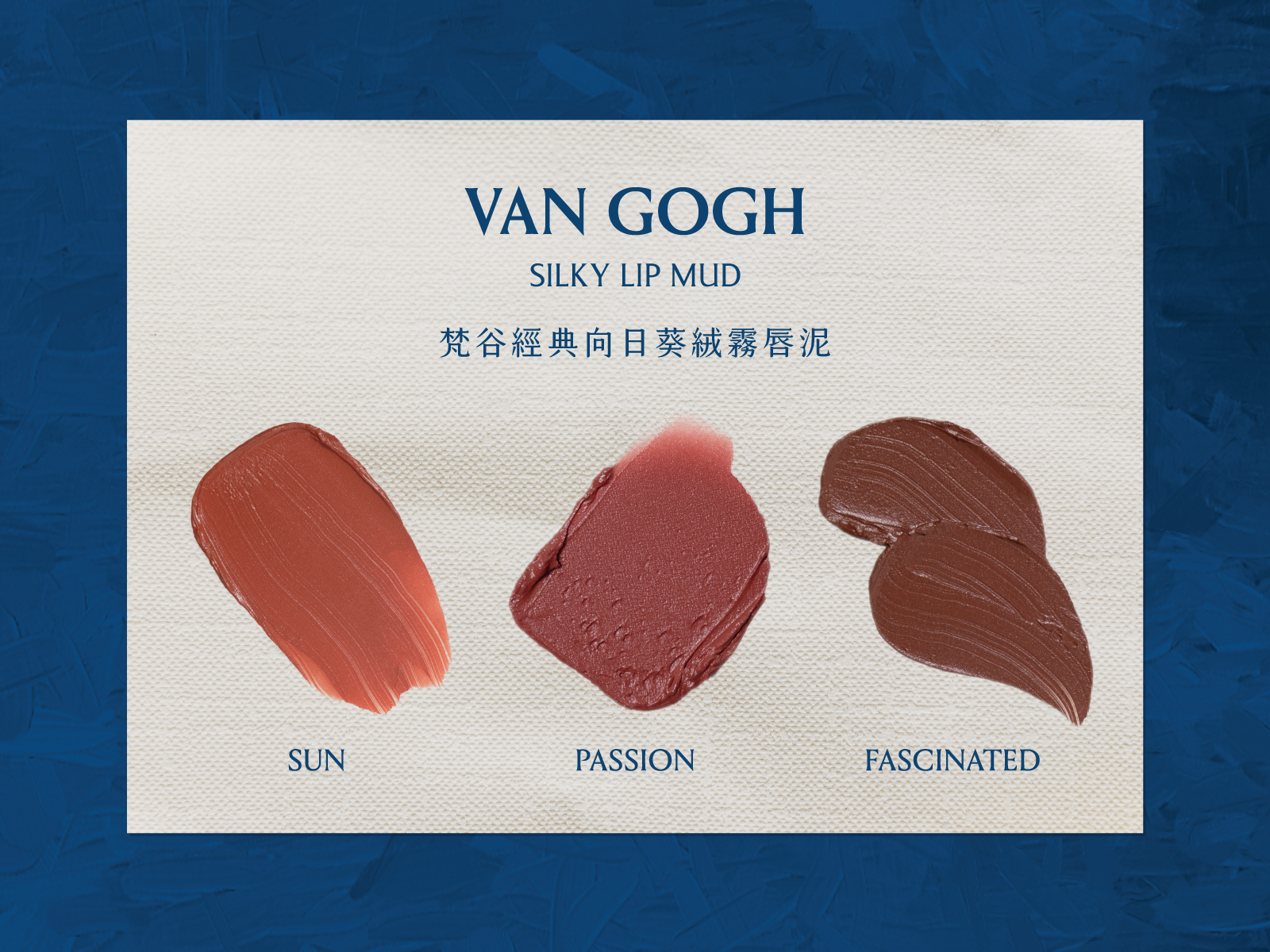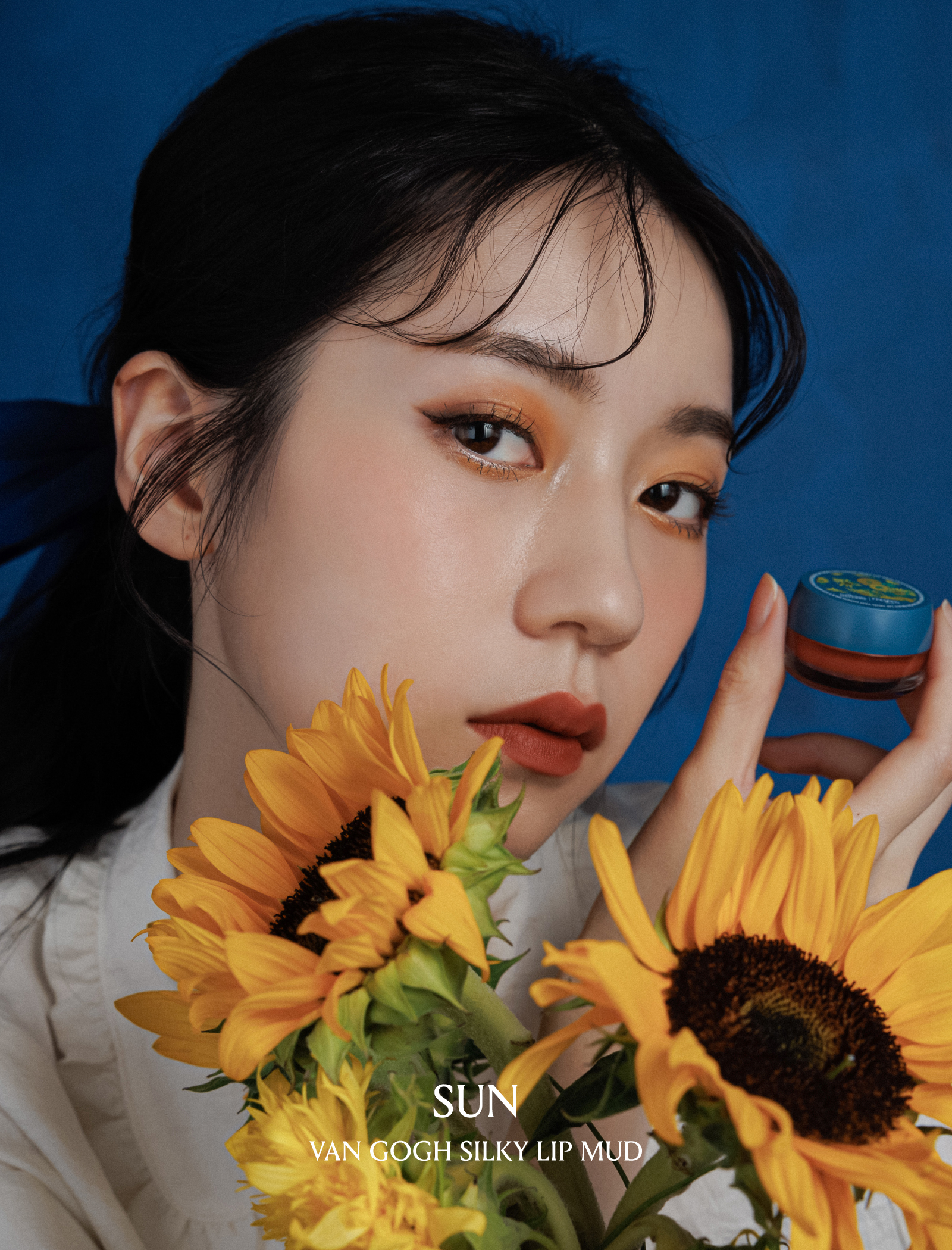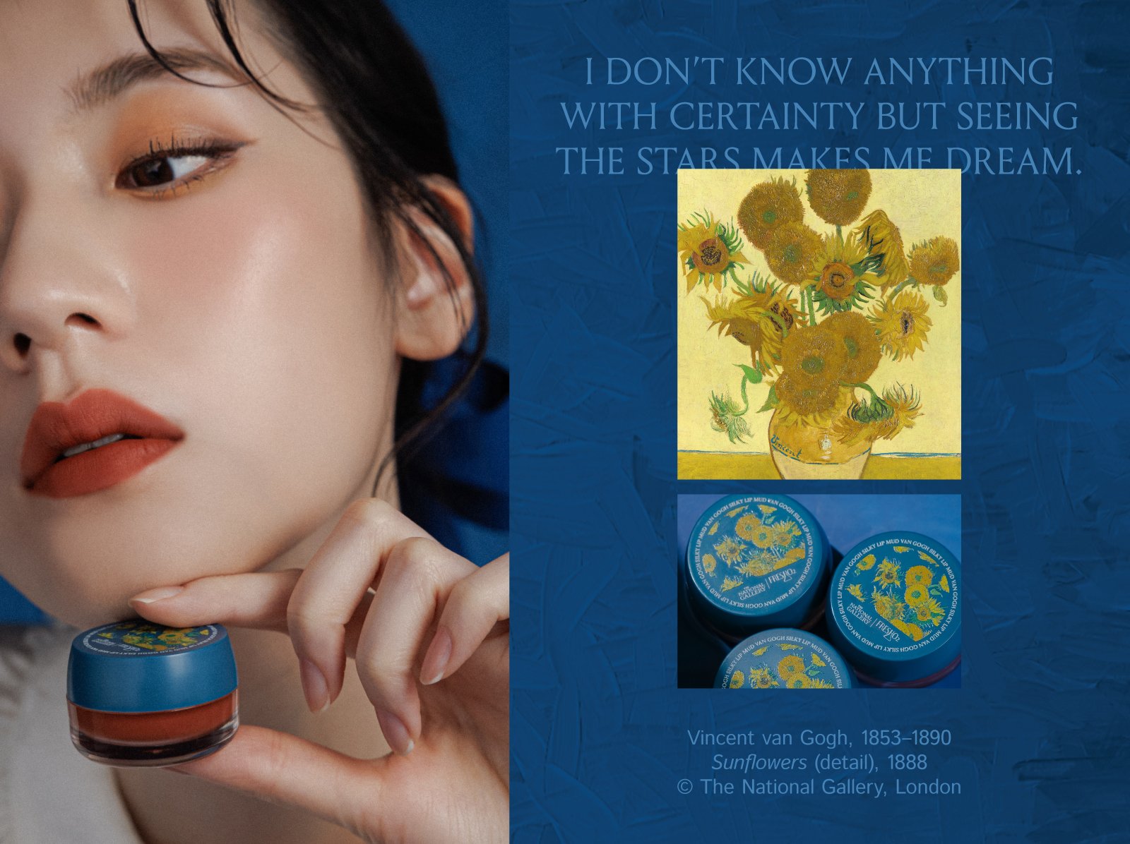 創意來自珍藏於英國國家美術館的人氣畫作「梵谷-永遠經典的向日葵」,選用罐裝唇泥結合梵谷向日葵經典畫作,嚴選三種色系,添加新技術彈力空氣粉體及細緻的雲母礦物粉末,如果凍空氣般彈潤,添加維他命E及白芒花籽油提升唇泥保濕度,上唇輕盈服貼,絨霧感收乾不緊繃,延展性極佳,展現完美色澤。