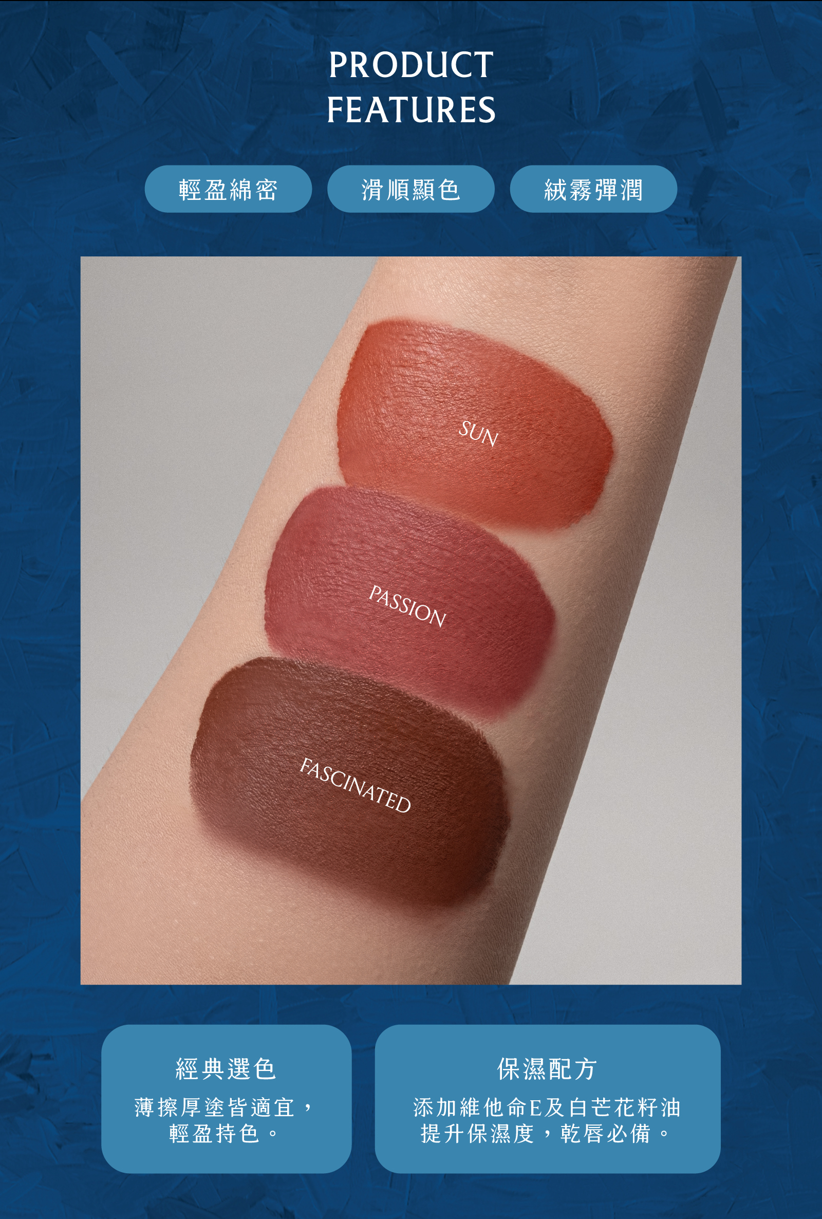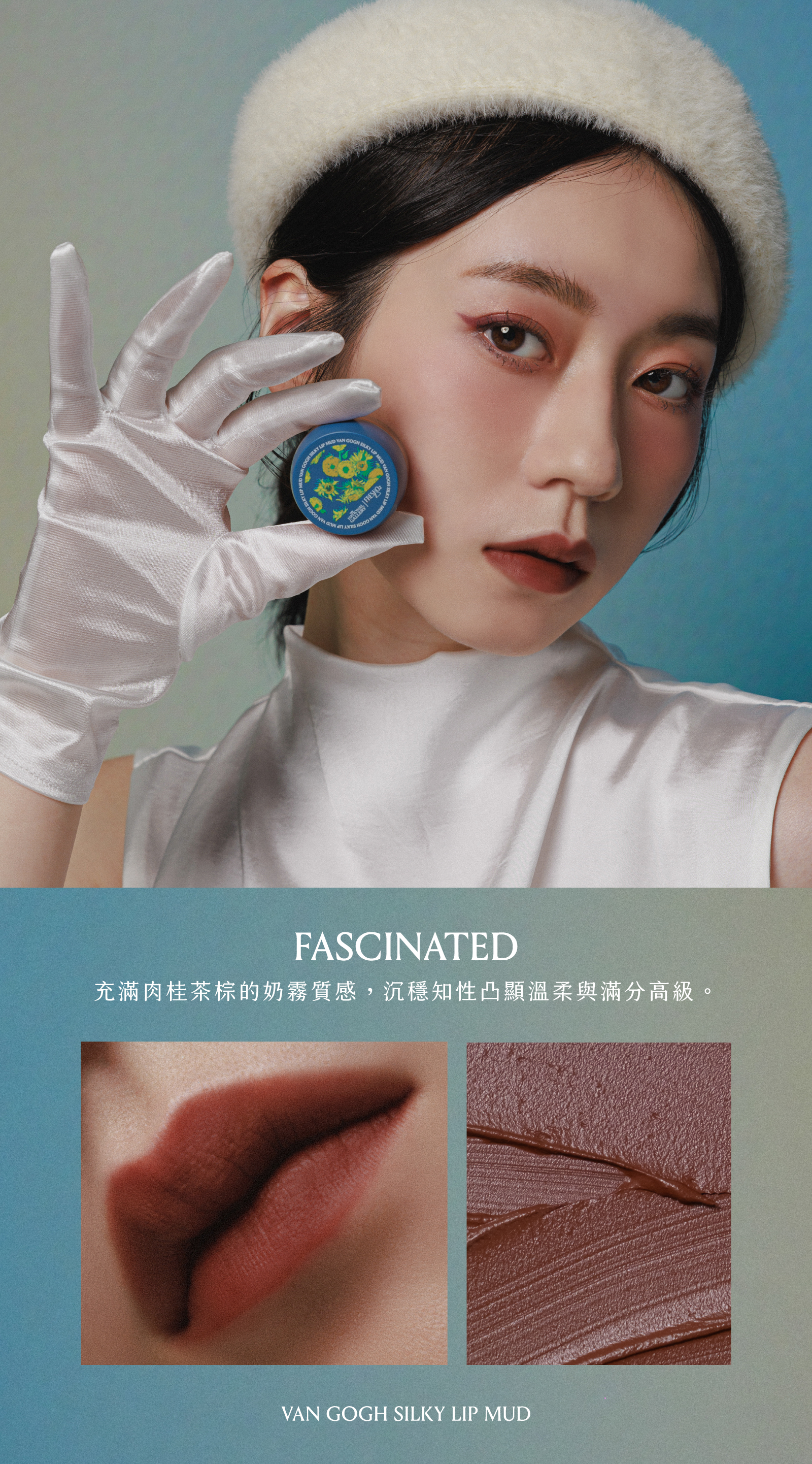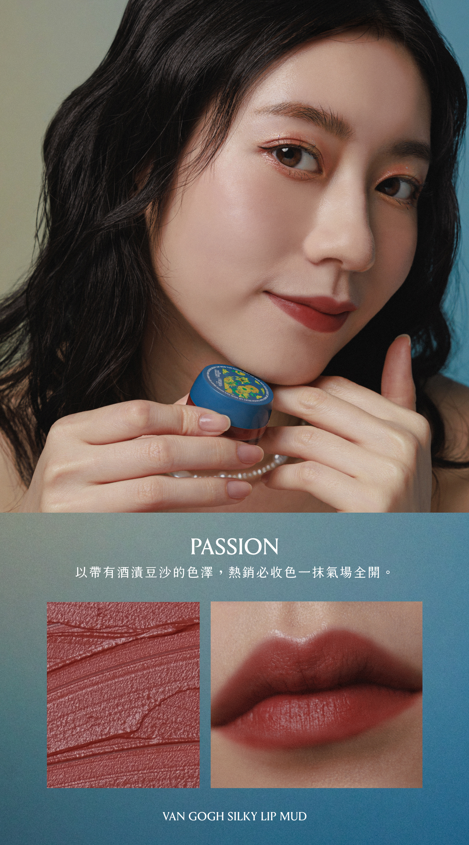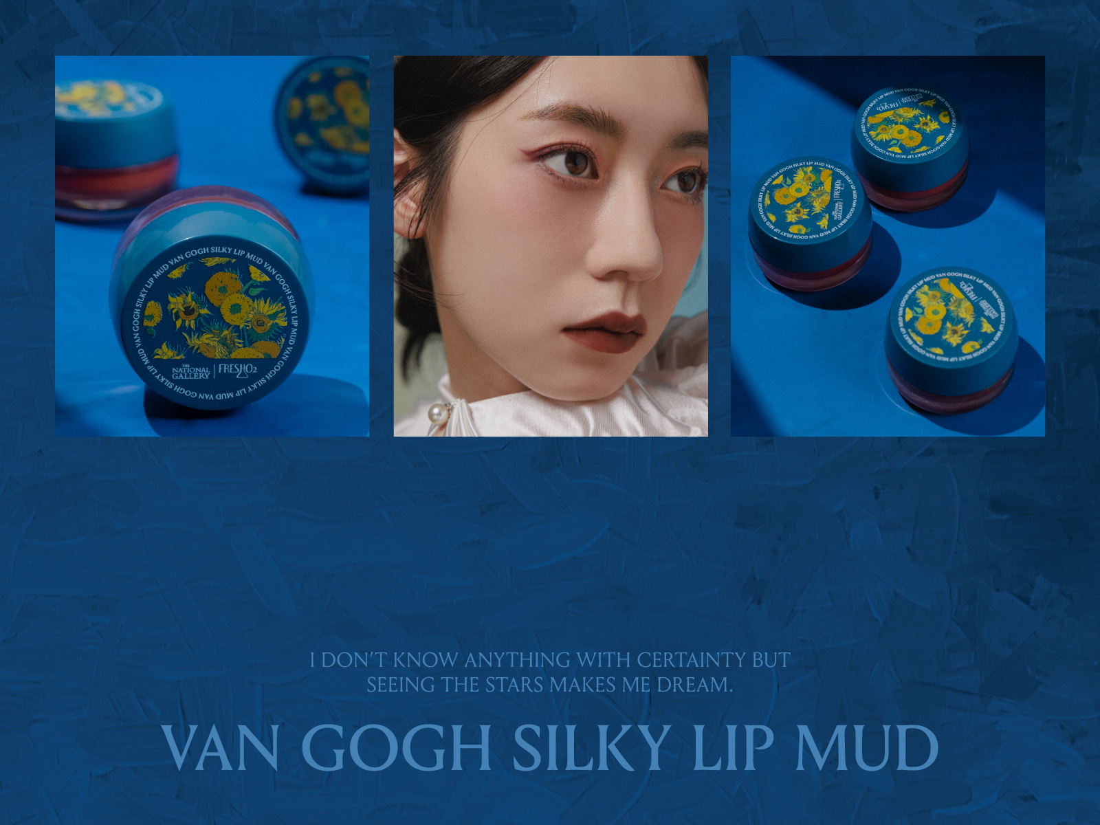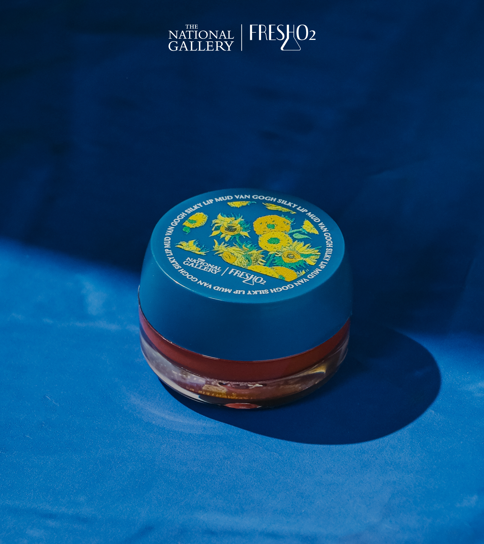 創意來自珍藏於英國國家美術館的人氣畫作「梵谷-永遠經典的向日葵」,選用罐裝唇泥結合梵谷向日葵經典畫作,嚴選三種色系,添加新技術彈力空氣粉體及細緻的雲母礦物粉末,如果凍空氣般彈潤,添加維他命E及白芒花籽油提升唇泥保濕度,上唇輕盈服貼,絨霧感收乾不緊繃,延展性極佳,展現完美色澤。